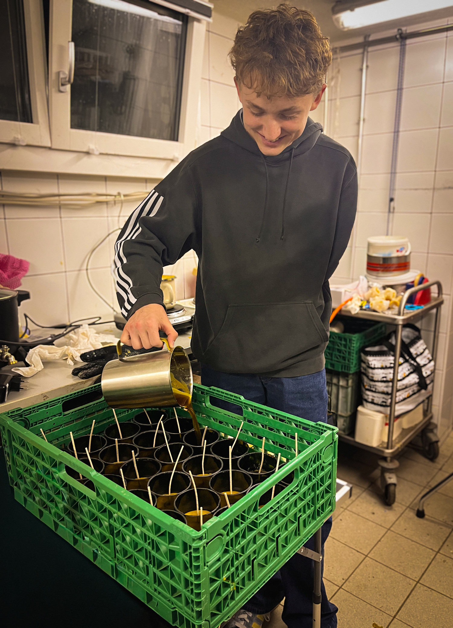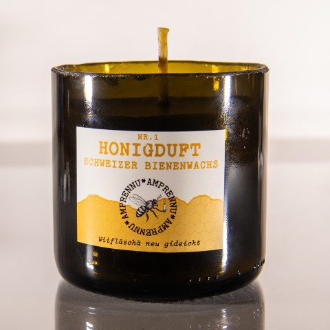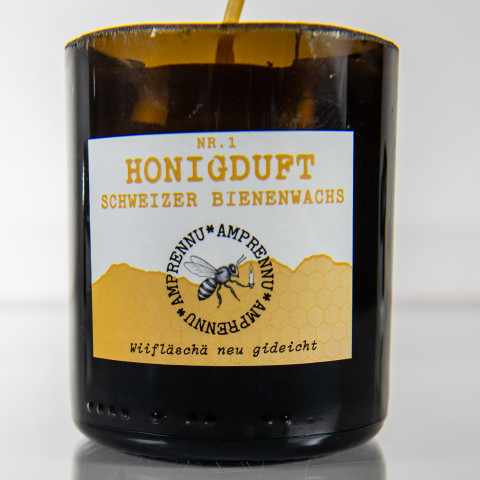 Wir sind "Amprennu" und produzieren aus aufgeschnittenen Weinflaschen und Schweizer Bienenwachs einzigartige Duftkerzen. Unser Name „Amprennu“ stammt aus dem Walliserdeutschen und bedeutet „anzünden“. Er passt perfekt zu unserem Produkt, denn unsere Duftkerzen entfalten ihren Duft vollständig beim Anzünden. Mit ihm schaffen wir eine natürliche und nachhaltige Alternative zu herkömmlichen Duftkerzen. Unser Anspruch ist es zu zeigen, dass Gegenstände, bei denen Recycling oft als einzige nachhaltige Option erscheint, durch Kreativität ein völlig neues Leben erhalten können. Genau dafür steht auch unser Slogan: „Wiifläschä neu gideicht“. Unser Ziel ist es, aus gebrauchten Weinflaschen ein hochwertiges neues Produkt zu kreieren und damit Ressourcen zu schonen, die im klassischen Recyclingprozess einen grossen Energieaufwand benötigen würden. Zudem legen wir grossen Wert auf Individualität und Handarbeit. Jeder Produktionsschritt erfolgt manuell, wodurch keine Kerze vollkommen identisch ist. Unsere Qualität liegt in der Einzigartigkeit, denn jede Kerze ist ein handgemachtes Unikat.