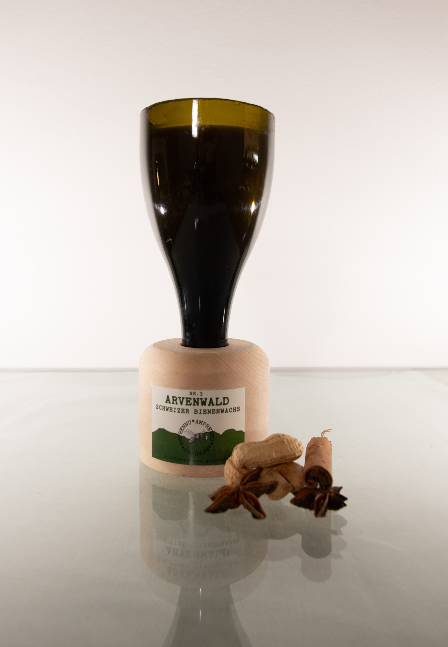 Die Premium Variante von unseren Duftkerzen. Gestützt von einem Sockel aus Arvenholz