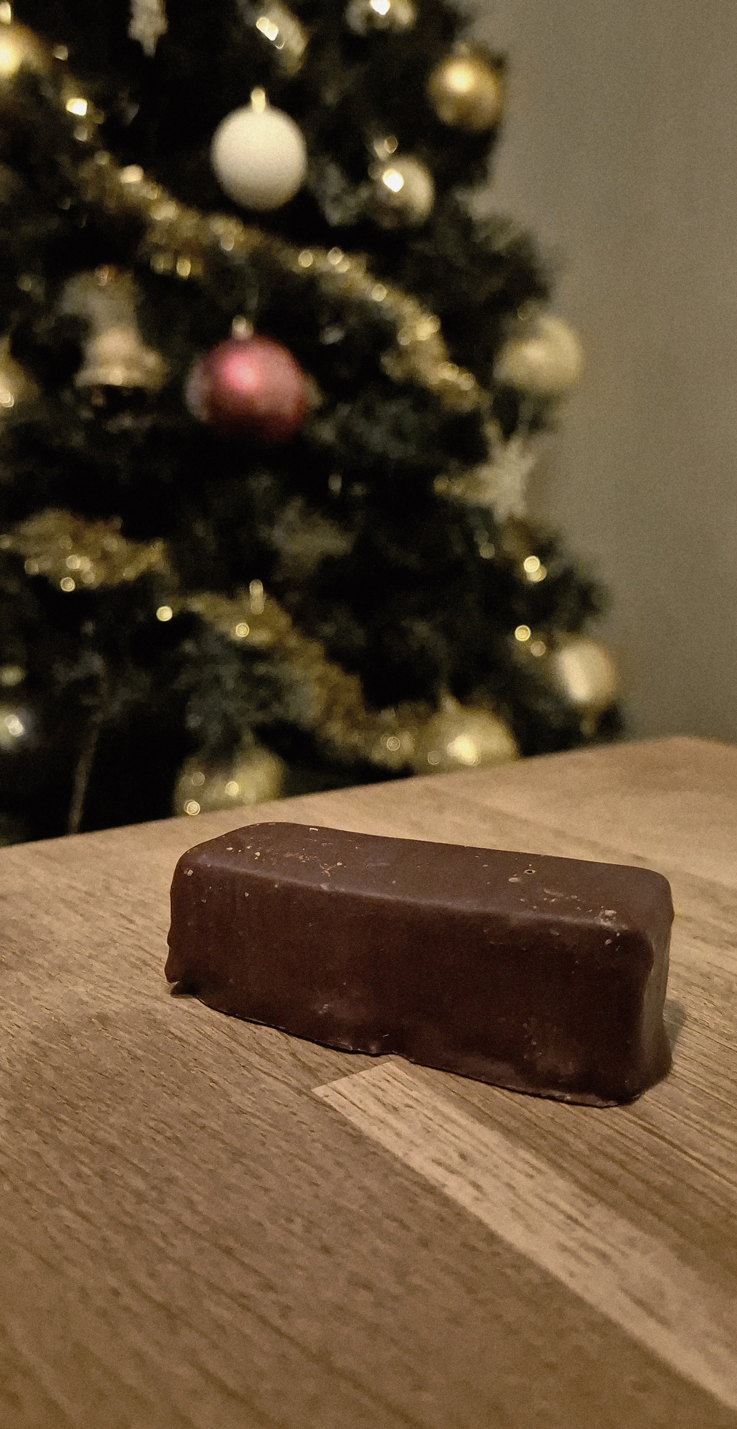 Barretta a base di cioccolato fondente con uno strato di cereali e miscuglio naturale di lavanda e L-teanina.