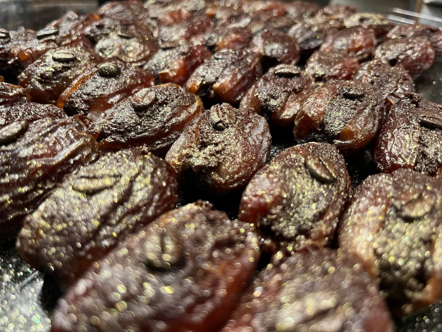 Bio-Datteln gefüllt mit einem Haselnuss-Dattel-Mus, vermischt mit Kaffee und geschmückt mit einer Kaffeebohne und Goldstaub.Das Beste: Ganz ohne Industriezucker.