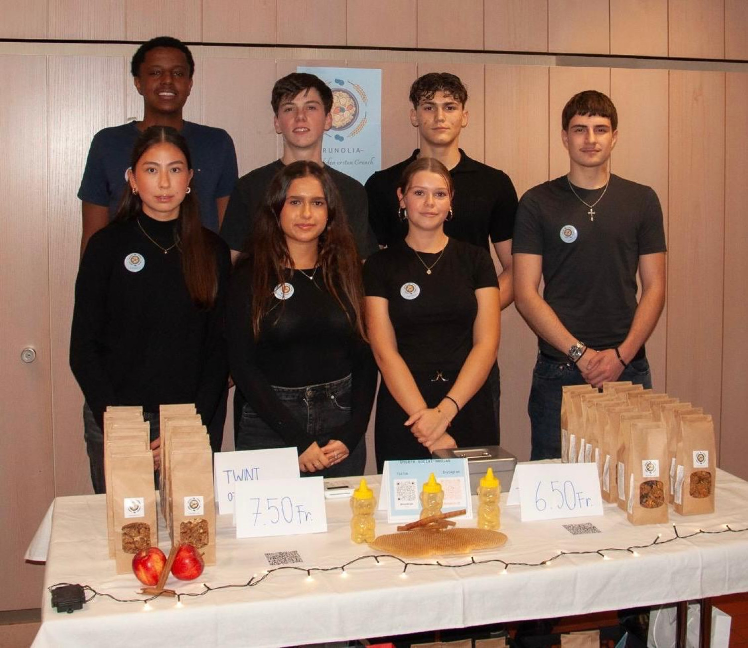 Wir sind sieben motivierte Schülerinnen und Schüler der Kantonsschule Zürich Nord und nehmen am Company Programm von YES teil. Mit unserem Start-up produzieren wir handgemachtes Granola aus Schweizer Haferflocken von Swissmill, gesüsst nur mit Honig und verfeinert mit Nüssen, Kernen und Früchten. Für unsere Apfel Edition verwenden wir gerettete Äpfel vom Feldhof Opfikon, bei dem wir als Dank einen Tag mitgearbeitet haben. Verpackt wird das Granola in kompostierbaren GreenBox-Verpackungen, und für jedes verkaufte Produkt spenden wir 15 Rappen an SOS-Kinderdorf. So verbinden wir Genuss, Nachhaltigkeit und soziales Engagement.