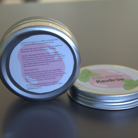 Es geht auch ohne Plastik! KauGrün bietet einen plastikfreien, zuckerfreien und biologisch abbaubarer Kaugummi in Geschmack Minze-Matcha an. Pro Aludöschen bekommen Sie 34g Kaugummi.