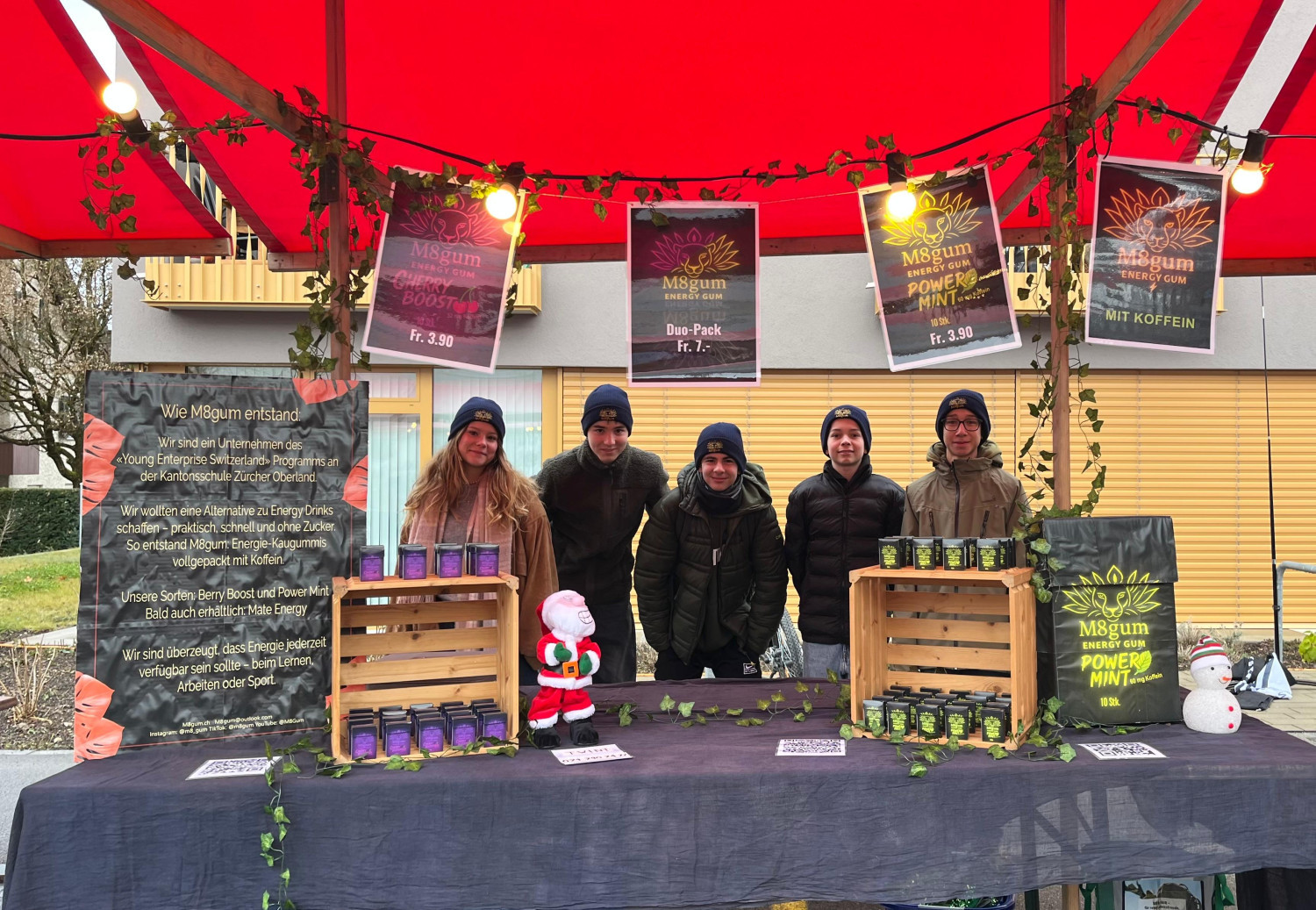 Wir sind M8gum und machen Energy-Kaugummis, die dir schnell und unkompliziert einen Energieschub geben. Unsere Gums sind klein, praktisch und so handlich, dass du sie wie einen guten "Mate" einfach überall dabeihaben kannst, ob beim Sport, im Büro oder unterwegs. Aktuell gibt’s zwei Sorten: Power Mint mit 60 mg Koffein für den frischen Kick und Cherry Boost mit 52 mg Koffein für den fruchtig-belebenden Push. Energie war noch nie so einfach..