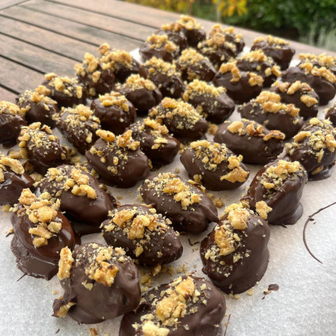 3 gefüllte Medjool-Datteln direkt aus Marokko, gefüllt mit feinster Walnusskernen. Ummantelt von edelster Schweizer Zartbitterschokolade, die der süßen Dattel den letzten Hauch von Perfektion verleiht.