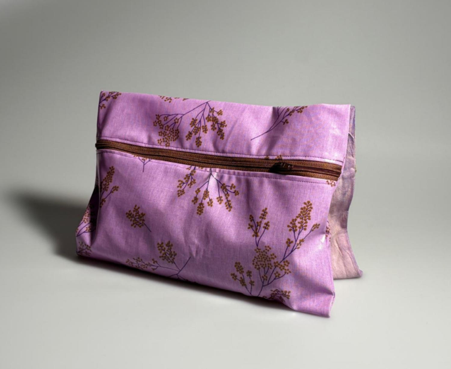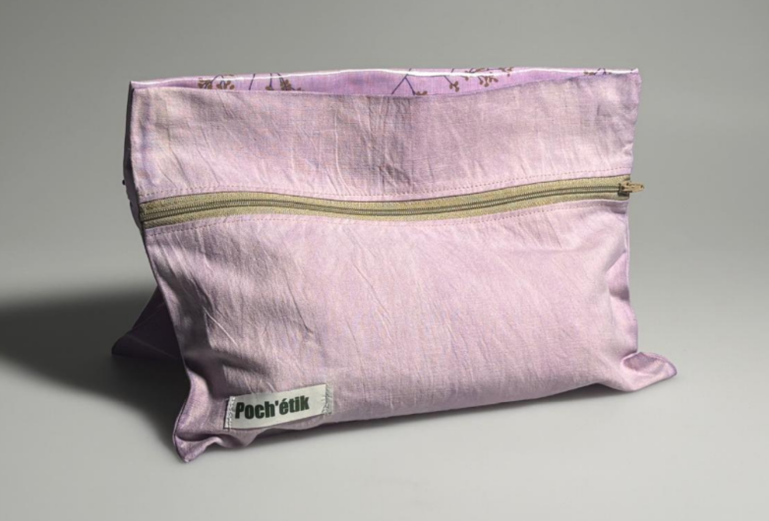 Poch’étik est une pochette divisée en deux compartiments, l’un étanche et l'autre en tissu simple. Nous recyclons de vieilles nappes et nous les teignons à partir de colorants naturels afin de les utiliser pour le côté non imperméable. Les tissus utilisés pour la partie imperméable sont certifié OEKO-TEX standard 100 afin de garantir la limitation de substances nocives pour la santé.