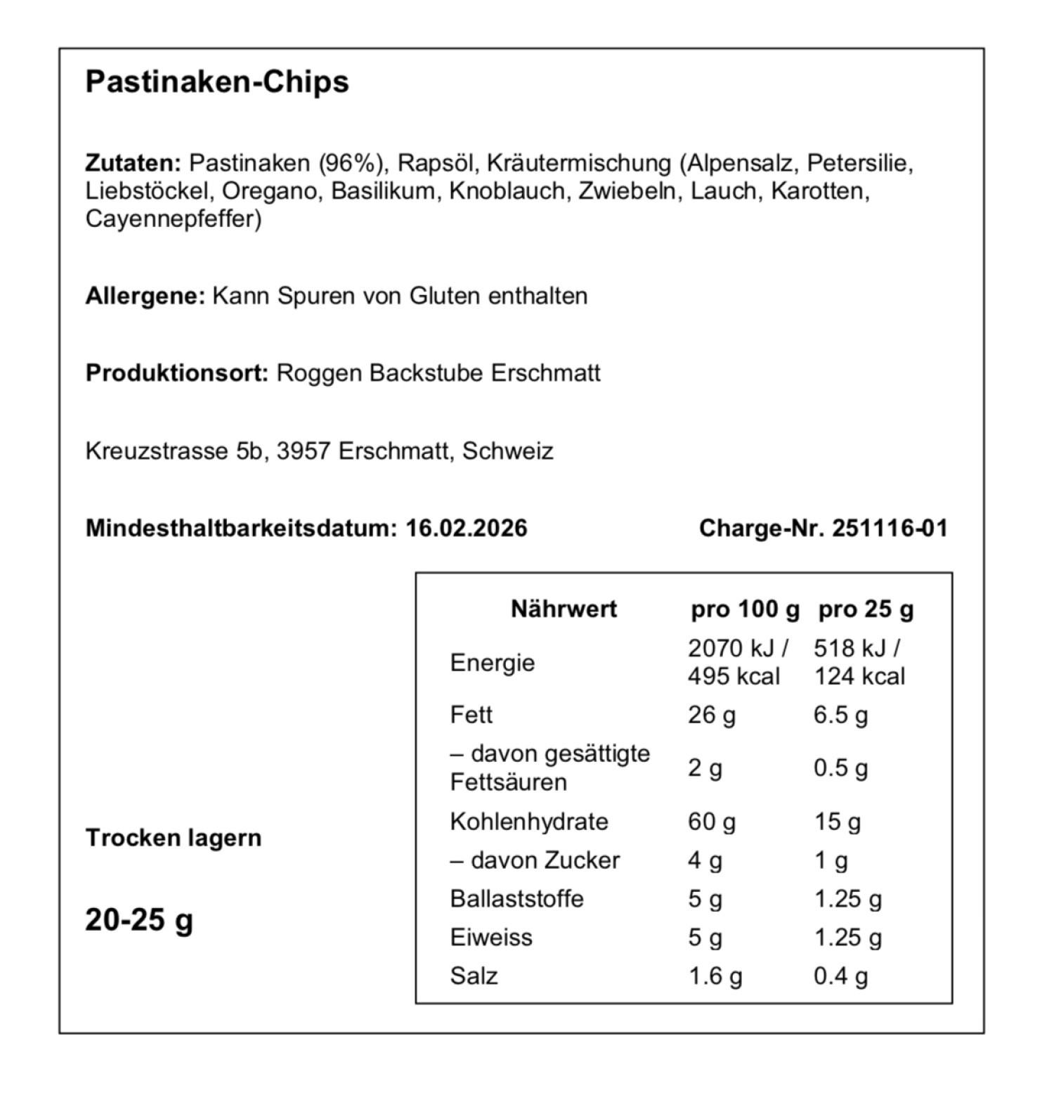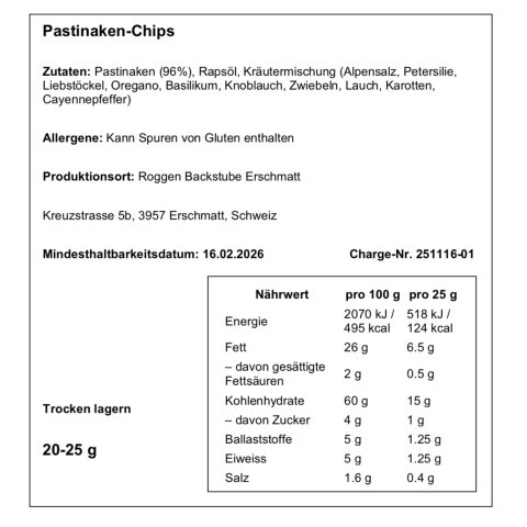 Knusprige Paschtinakächips aus regionalem, saisonalem Gemüse, fein veredelt mit Alpenkräuter und Salz Natürlich im Geschmack, schonend verarbeitet und ideal als salziger Snack für zwischendurch.