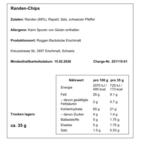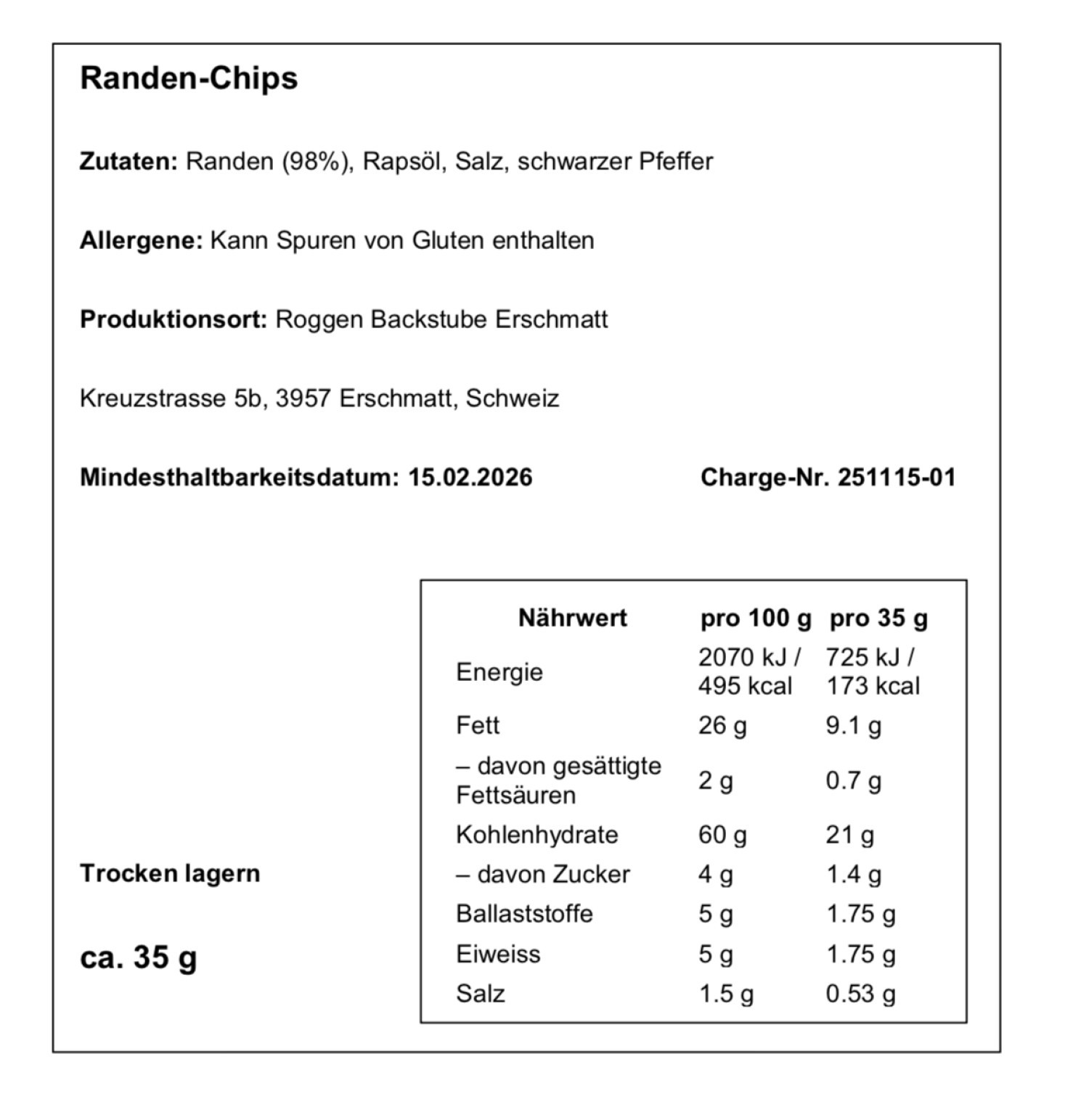 Knusprige Randächips aus regionalem, saisonalem Gemüse, fein veredelt mit Pfeffer und Salz. Natürlich im Geschmack, schonend verarbeitet und ideal als salziger Snack für zwischendurch.