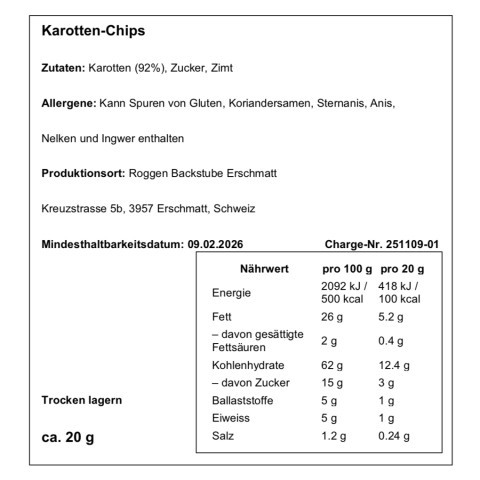Knusprige Rieblichips aus regionalem, saisonalem Gemüse, fein veredelt mit Zimt und Zucker. Natürlich im Geschmack, schonend verarbeitet und ideal als süßer Snack für zwischendurch.