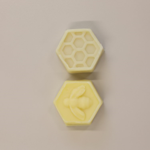 La saponetta alla cera d'api e miele ha come base olio d'oliva, olio di cocco, olio di ricino, cera d'api, soda caustica, acqua e miele di tiglio artigianale. Si tratta di una piccola saponetta a forma esagonale.