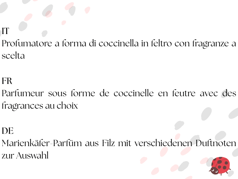 Siamo un giovane team di ragazze che ha dato vita a ScentBuglets, una nuova impresa dedicata al benessere e alla cura degli ambienti quotidiani. La nostra idea nasce dal desiderio di unire profumo, design e originalità in un unico prodotto capace di regalare emozioni e migliorare la giornata. I nostri prodotti sono profumi per ambienti a forma di coccinella di pezza, un’icona di dolcezza e fortuna, pensata per portare gioia e armonia in ogni spazio. Ogni prodotto è realizzato con fragranze selezionate attentamente per evocare ricordi, stimolare sensazioni positive e rendere la casa, l’armadio o qualsiasi altro ambiente un luogo più accogliente e piacevole. La nostra missione è semplice ma ambiziosa: rendere gli ambienti dove viviamo e lavoriamo più piacevoli, profumati e unici, attraverso una proposta che unisce design originale, attenzione al dettaglio e un piccolo augurio di fortuna.