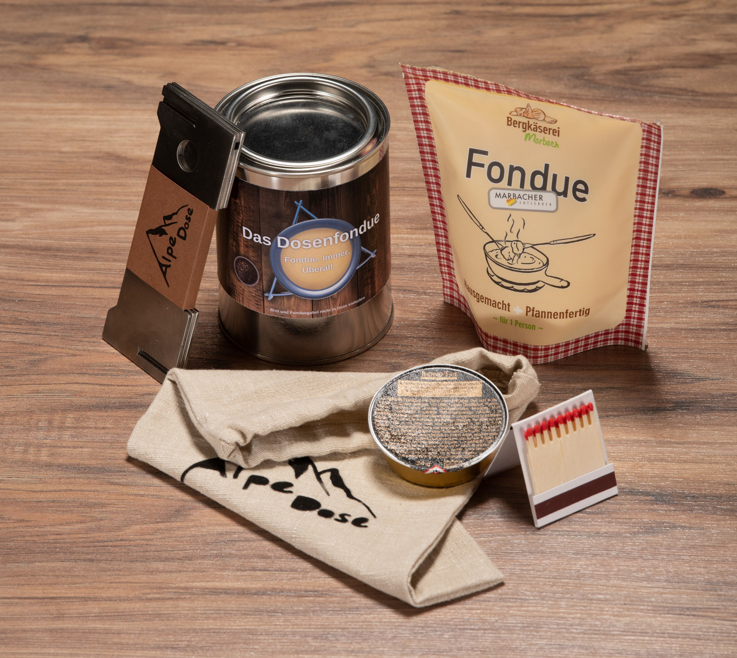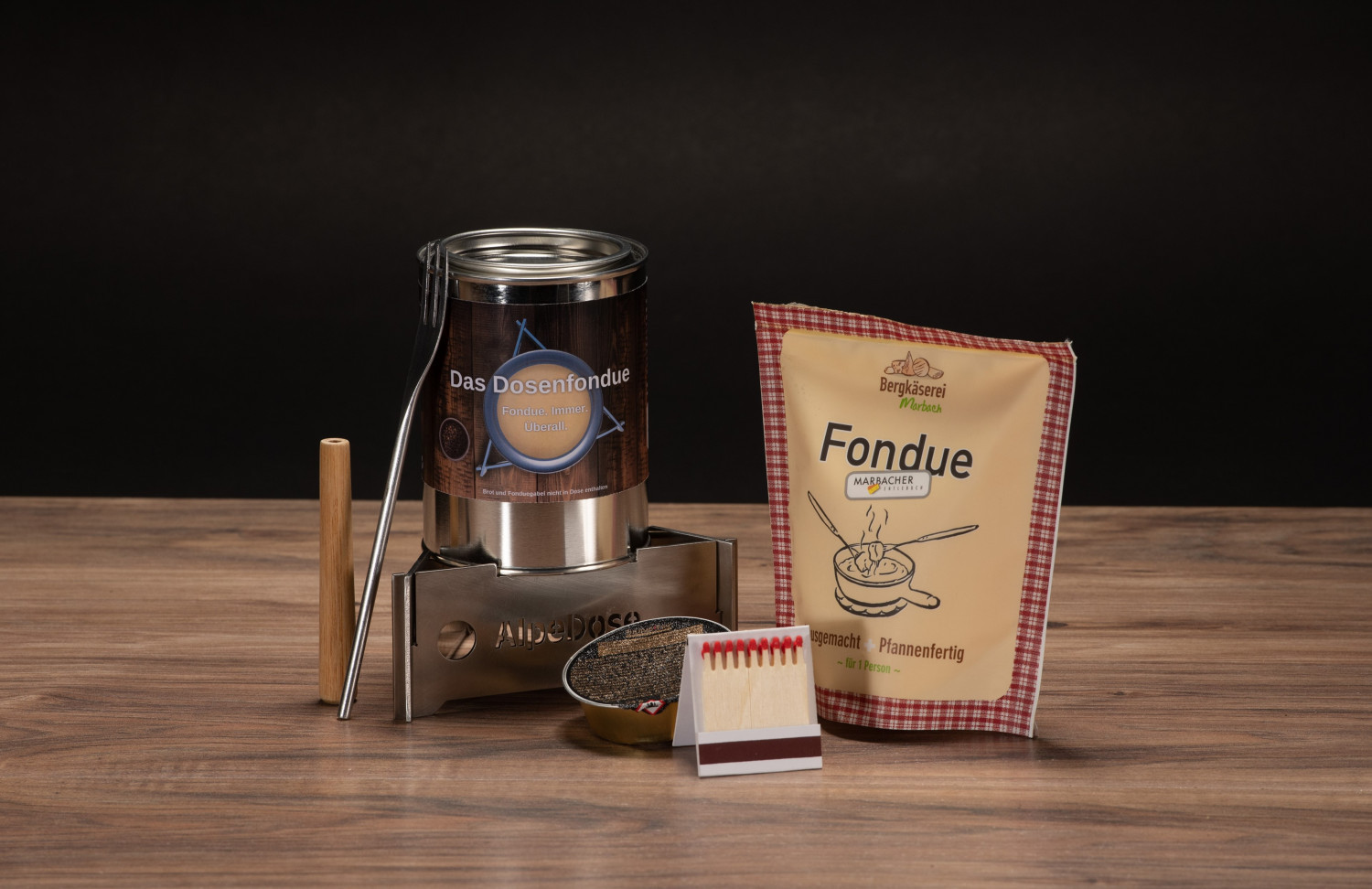 Neben dem aus rostfreiem Stahl gefertigten Rechaud beinhaltet das AlpeDose Starterkit eine Dose Marbacher Käsefondue inklusive Brennpaste und Streichhölzer und ist somit auf der Stelle einsatzbereit.
