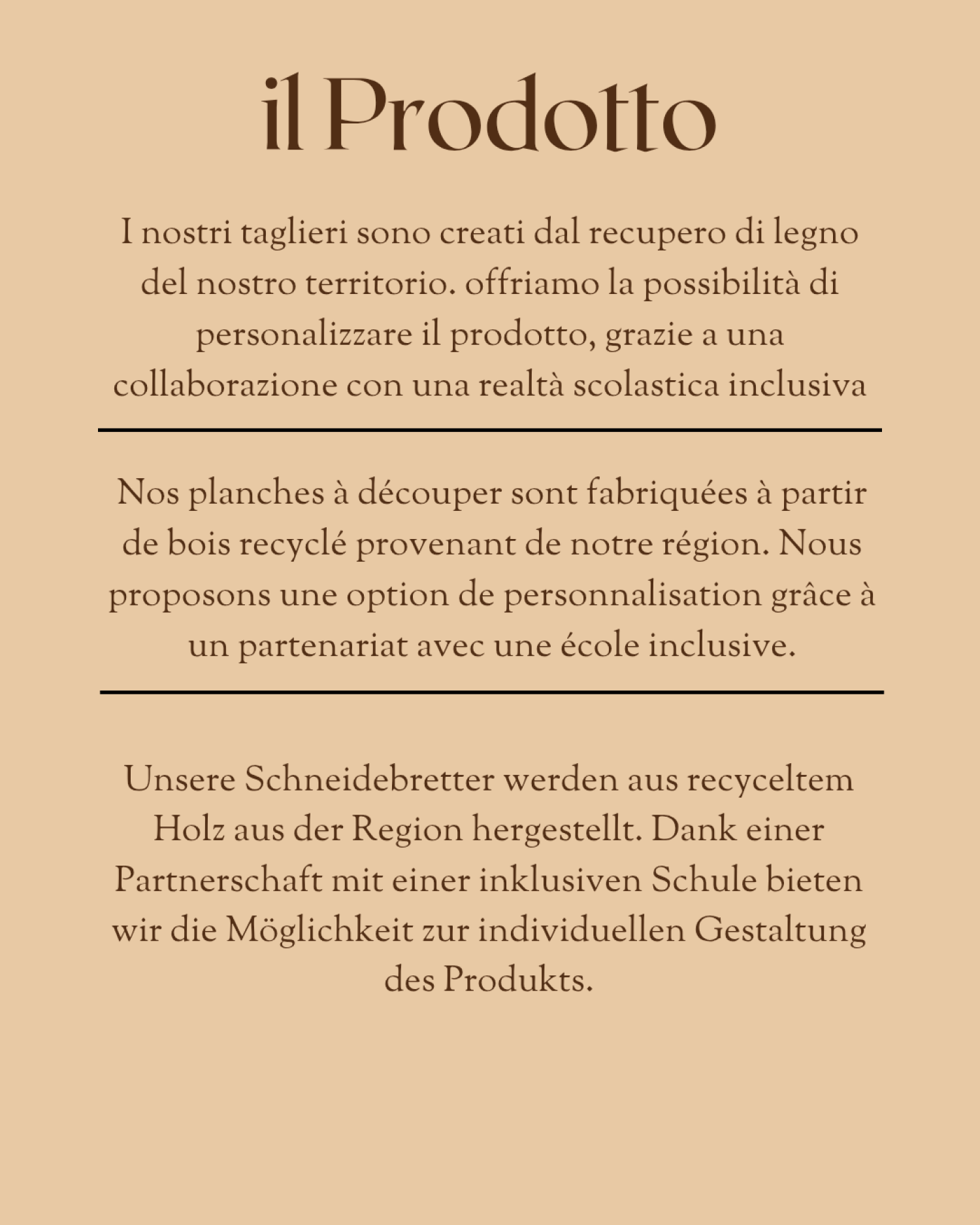 Taglieri prodotti con legno di scarto da Simone Bosio Sagl, con misure di 25 x 15 cm, con spessore di 1 cm e possibilità di personalizzazione.