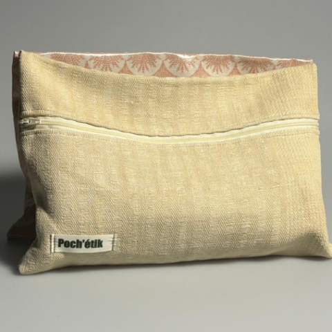 Poch’étik est une pochette divisée en deux compartiments, l’un étanche et l'autre en tissu simple. Nous recyclons de vieilles nappes et nous les teignons à partir de colorants naturels afin de les utiliser pour le côté non imperméable. Les tissus utilisés pour la partie imperméable sont certifié OEKO-TEX standard 100 afin de garantir la limitation de substances nocives pour la santé.