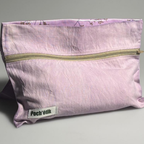 Poch’étik est une pochette divisée en deux compartiments, l’un étanche et l'autre en tissu simple. Nous recyclons de vieilles nappes et nous les teignons à partir de colorants naturels afin de les utiliser pour le côté non imperméable. Les tissus utilisés pour la partie imperméable sont certifié OEKO-TEX standard 100 afin de garantir la limitation de substances nocives pour la santé.