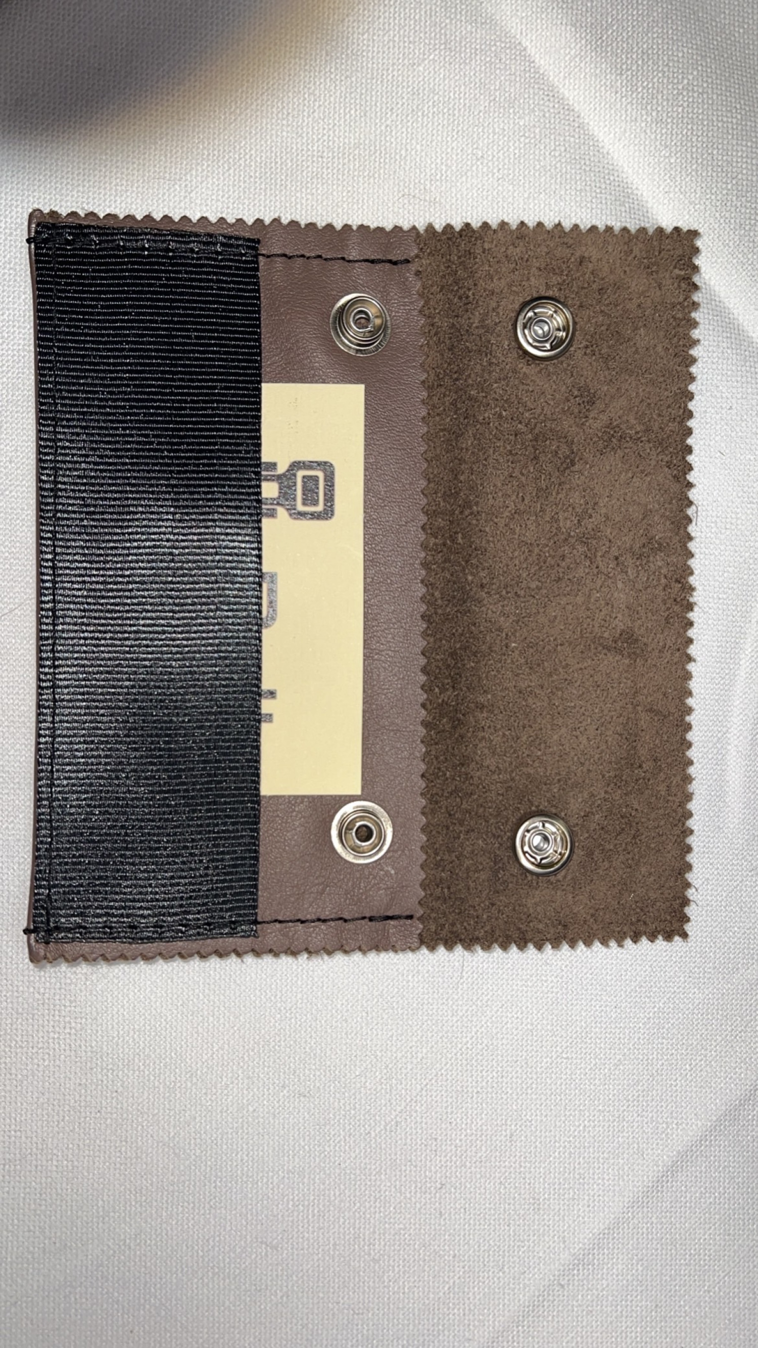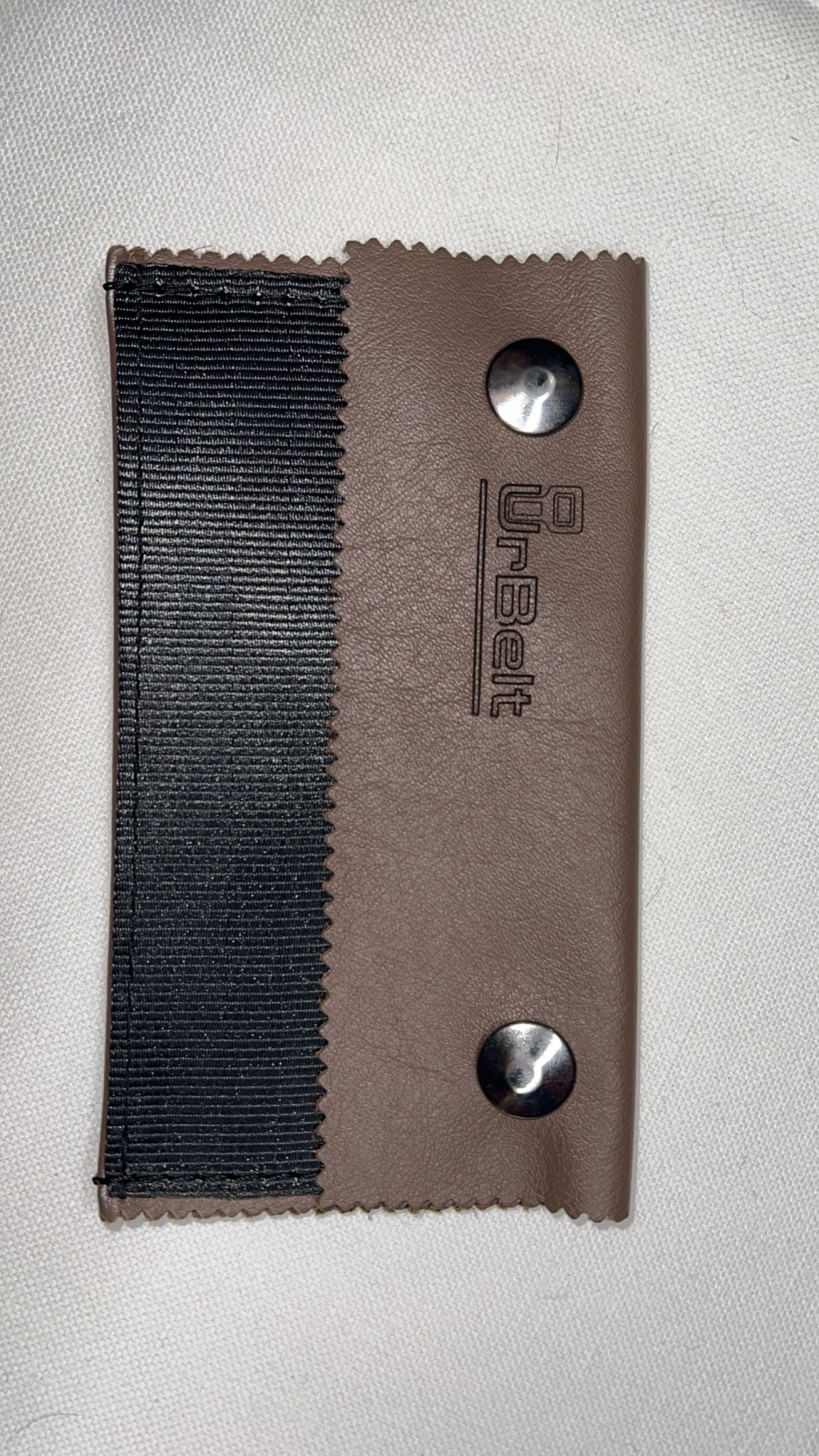 Porta oggetti versatile con pelle grigia tendente al marrone e cintura di sicurezza nera riciclate, logo colore nero con bottoni a pressione argentati lucidi.