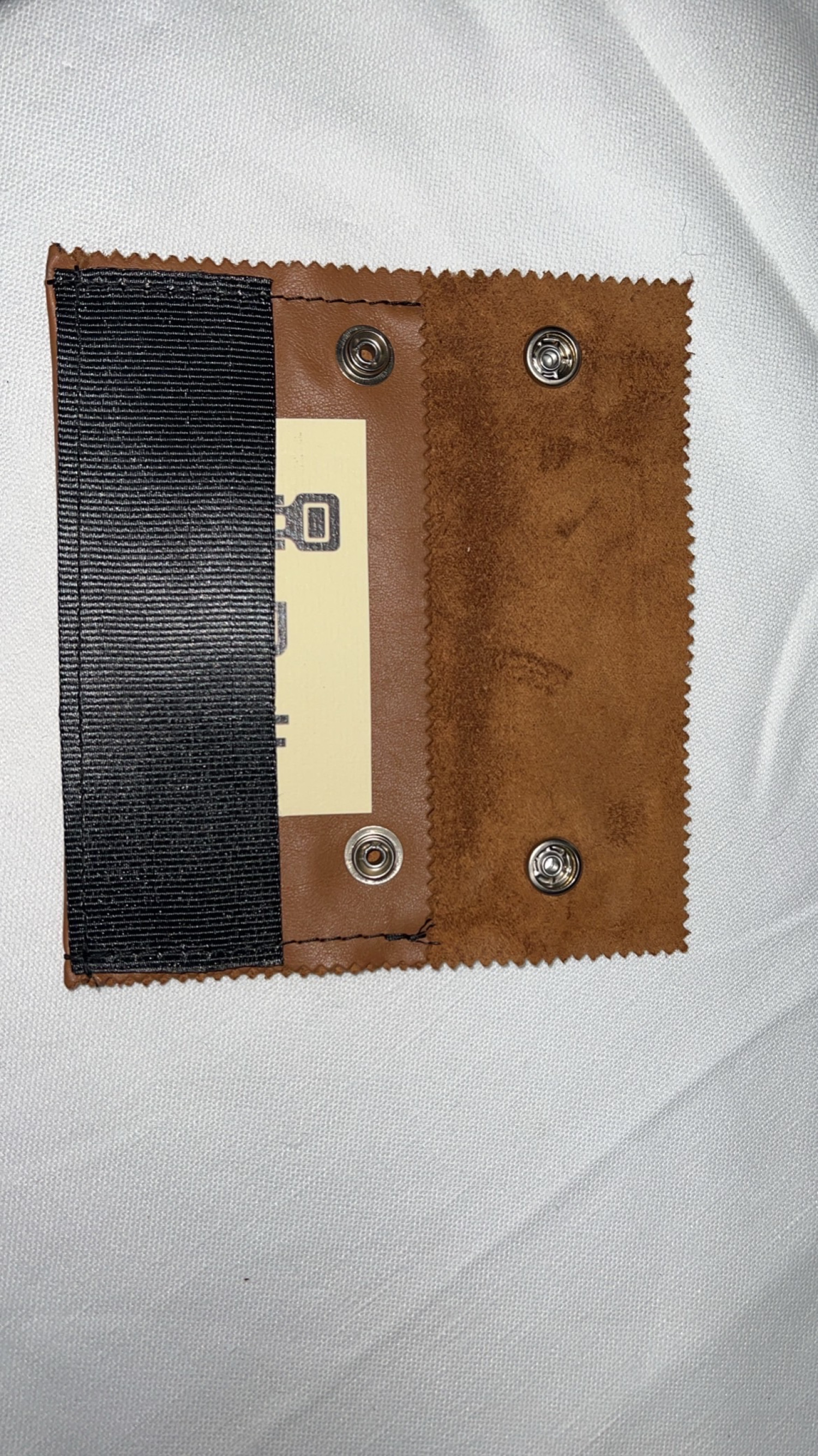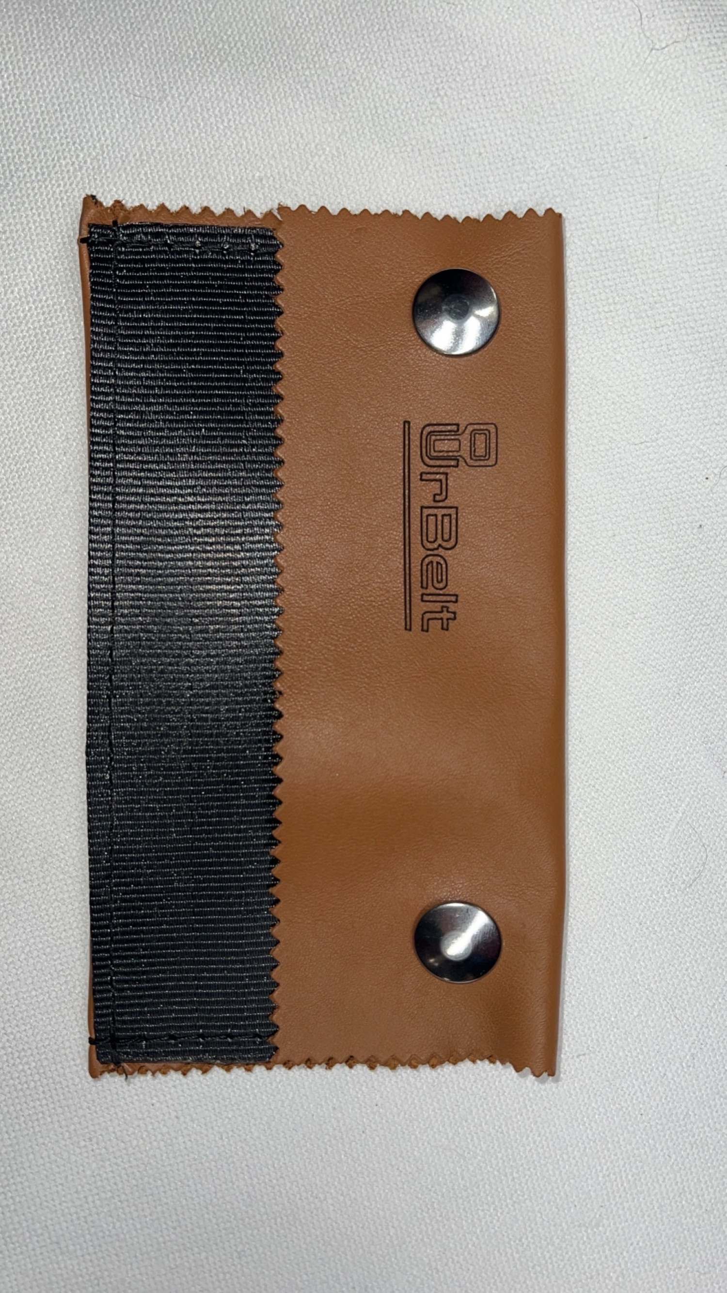 Porta oggetti versatile con pelle marrone tendente al rosso e cintura di sicurezza nera riciclate, logo color nero con bottoni a pressione argentati lucidi.