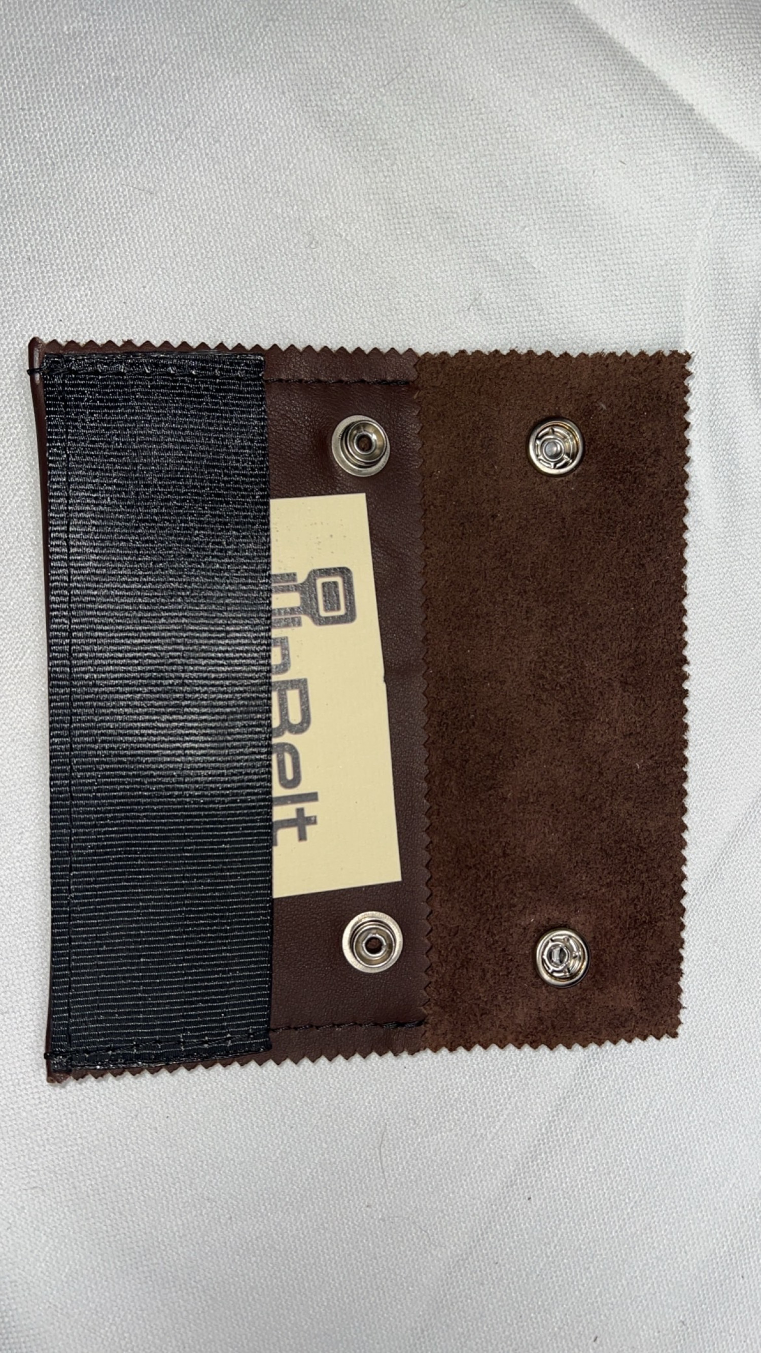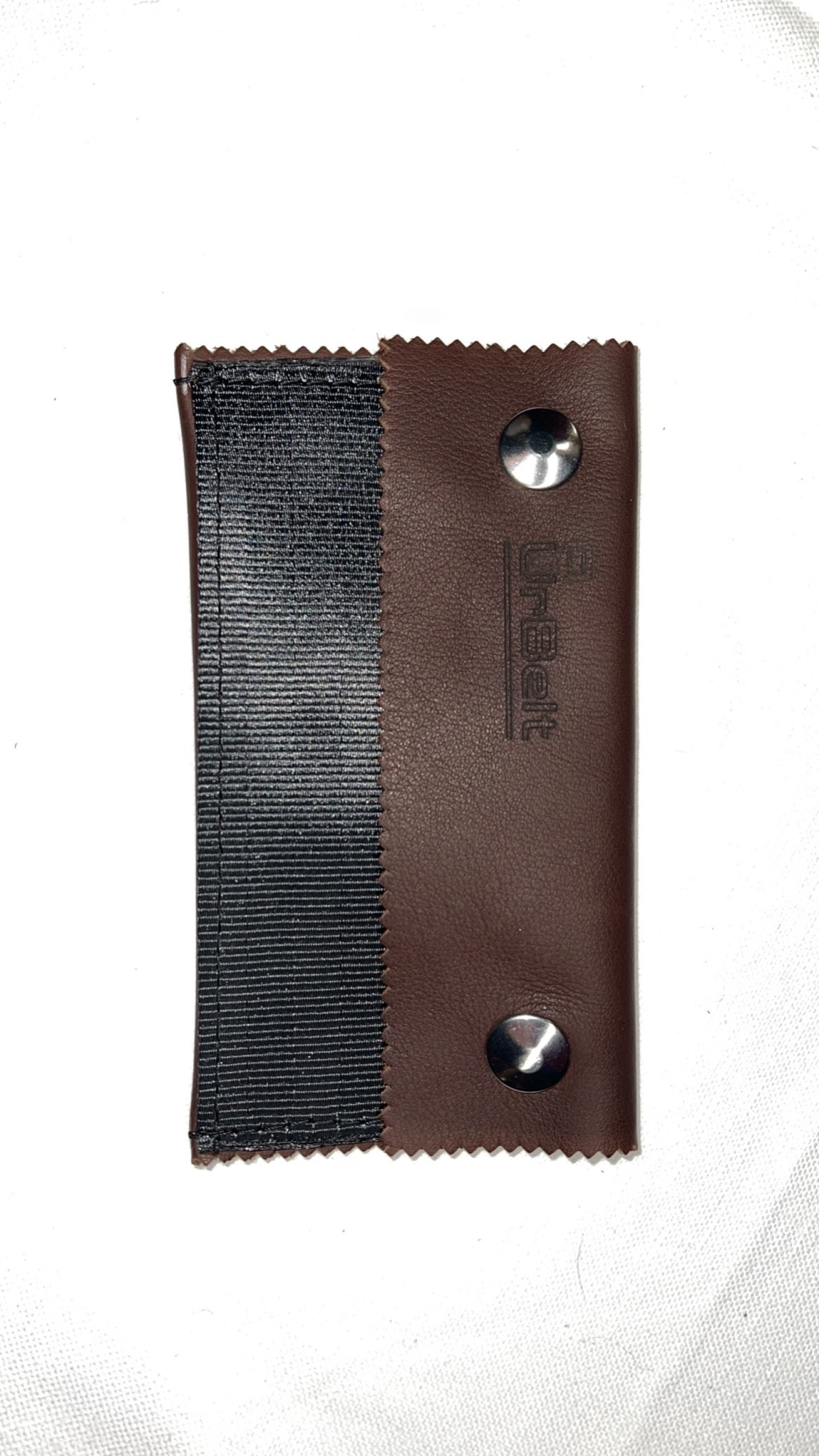 Porta oggetti versatile con pelle marrone scuro e cintura di sicurezza nera riciclate, logo colore nero con bottoni a pressione argentati lucidi.