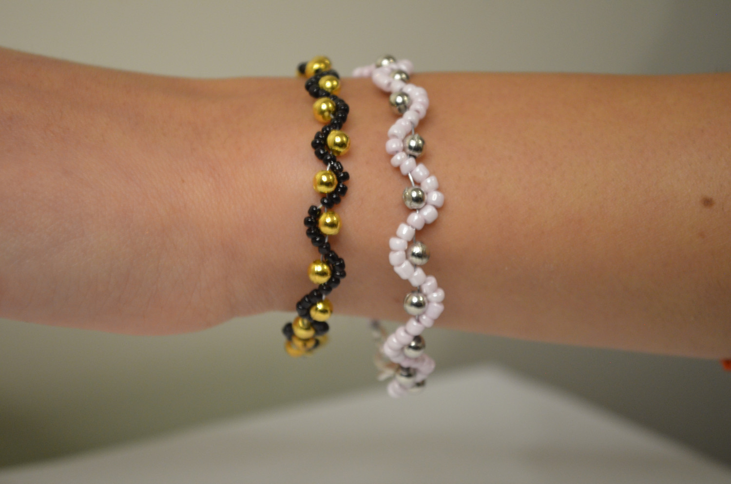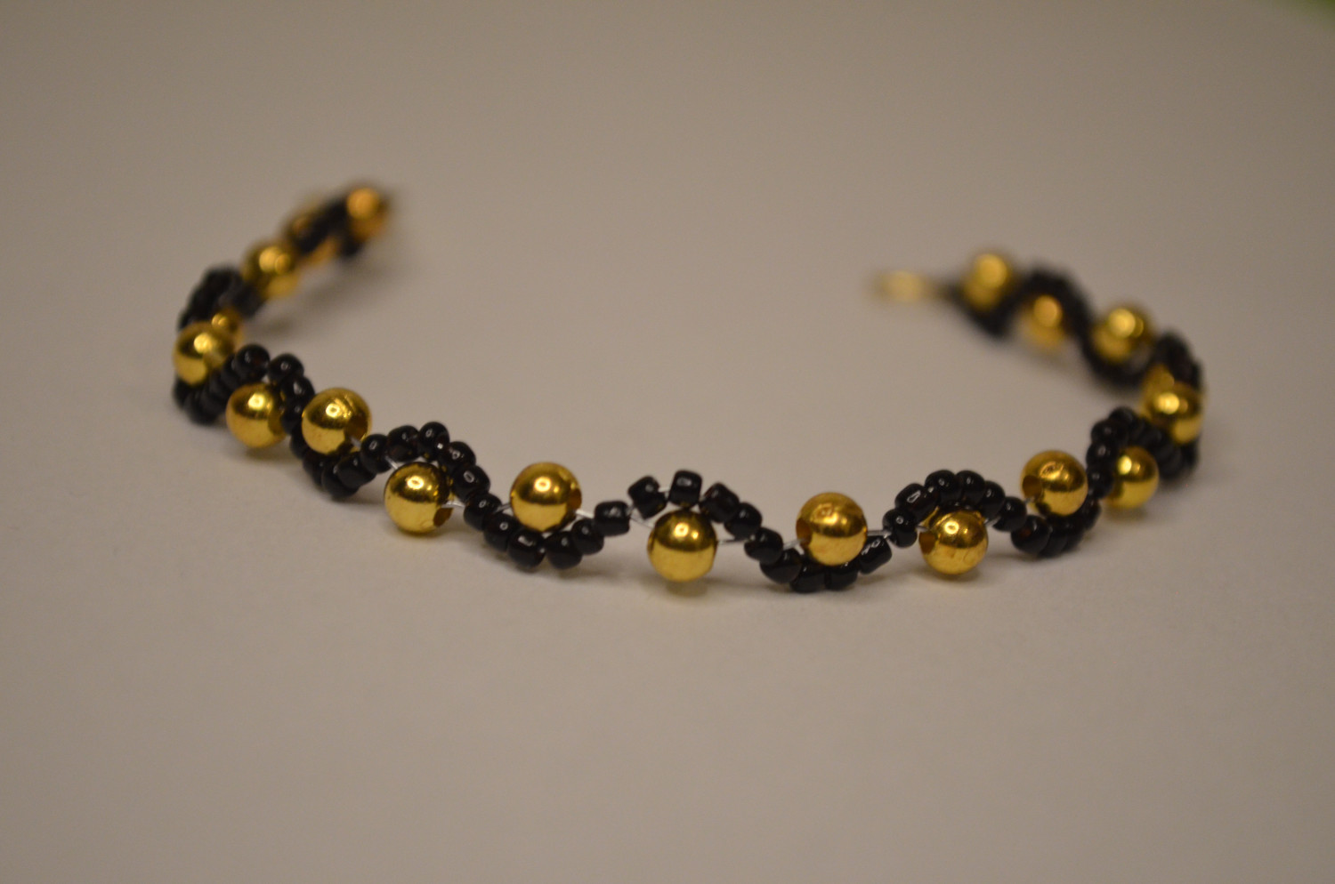 Ist ein handgemachtes Armband aus goldfarbigen Kugelperlen und kleinen schwarzen Glasperlen. Die schwarzen Perlen sind in einer geschwungenen, wellenartigen Linie gefädelt, zwischen denen die goldenen Perlen gleichmäßig eingesetzt sind.