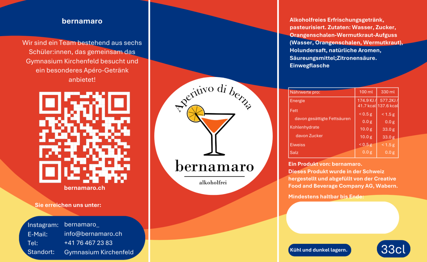 Unser erfrischendes Apéro-Getränk ist ein bittersüsser, alkoholfreier Drink. perfekt für jeden Anlass. Ob Grillabend mit den Nachbarn oder gemütliches Abendessen mit Freunden und Familie - bernamaro ist genau das Richtige für Sie. Wir entwicklen und produzieren mit der «Creative Food and Beverage Company» aus Wabern, Bern zusammen.