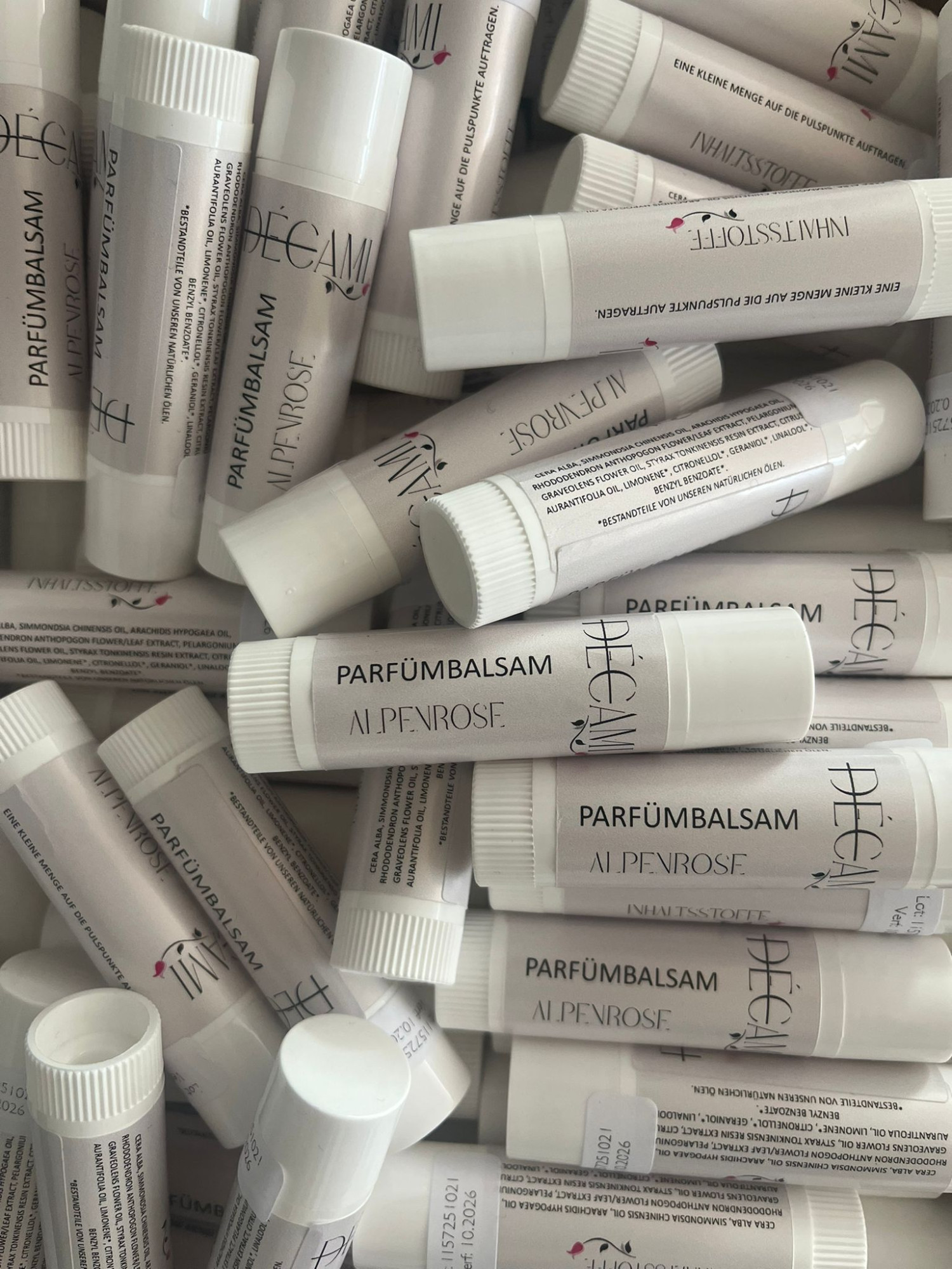 Wir verkaufen Parfümbalsam in Form einer handlichen Lippenpomade. Er enthält sorgfältig ausgewählte, natürliche Inhaltsstoffe und Alpenrosenextrakt, der dem Stick eine blumige Note sowie eine feuchtigkeitsspendende Wirkung verleiht. Die Rezeptur wurde gemeinsam mit Fachpersonen entwickelt und so konzipiert, dass sie beim Auftragen auf die Haut deren natürliche Aufnahme unterstützt. Dadurch können die pflegenden Stoffe besser wirken, und der Duft bleibt länger erhalten. Hergestellt in der Drogerie Schneider in Thusis, vereint unser Produkt Qualität, Natürlichkeit und regionale Handarbeit.