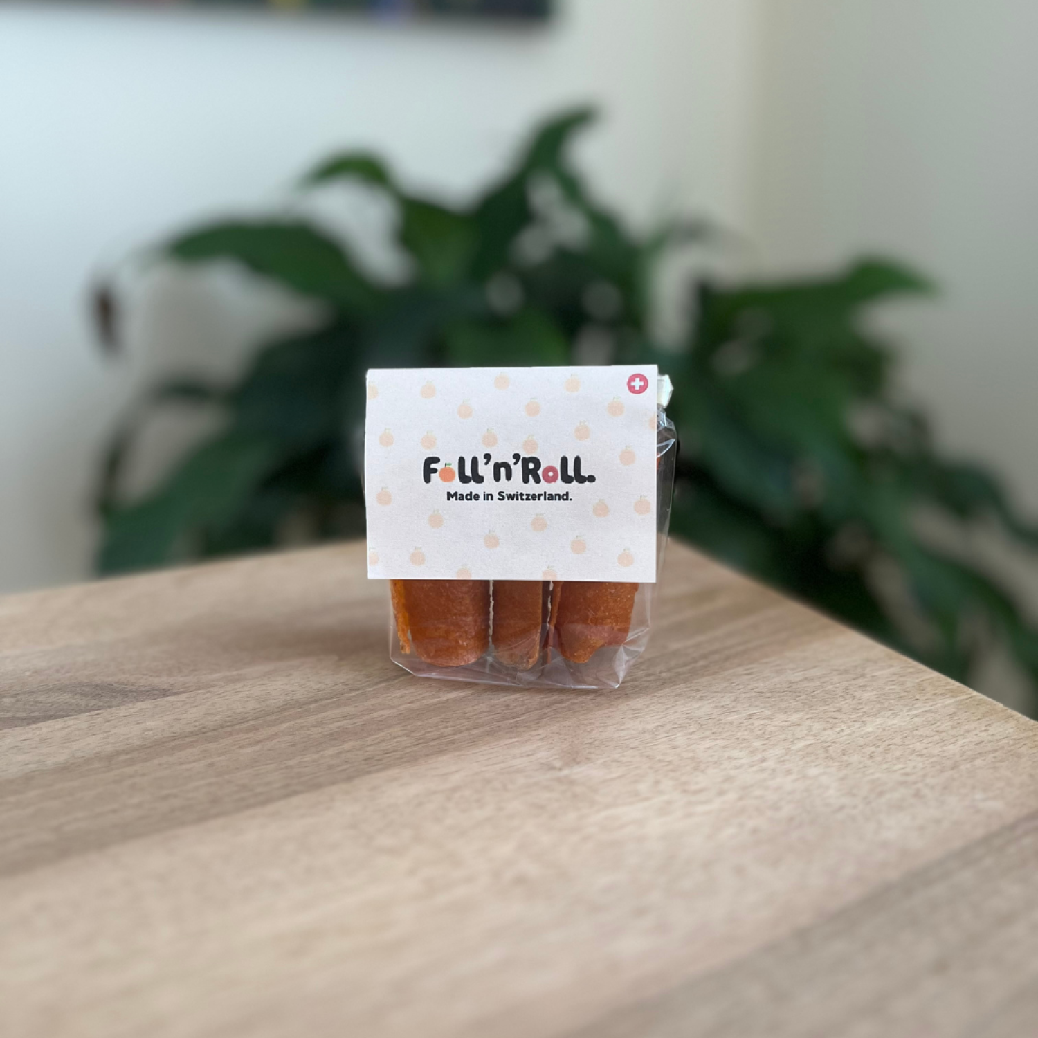 Fruchtrollen aus 100% Schweizer Aprikosen. Perfekt für den kleinen Hunger zwischendurch.