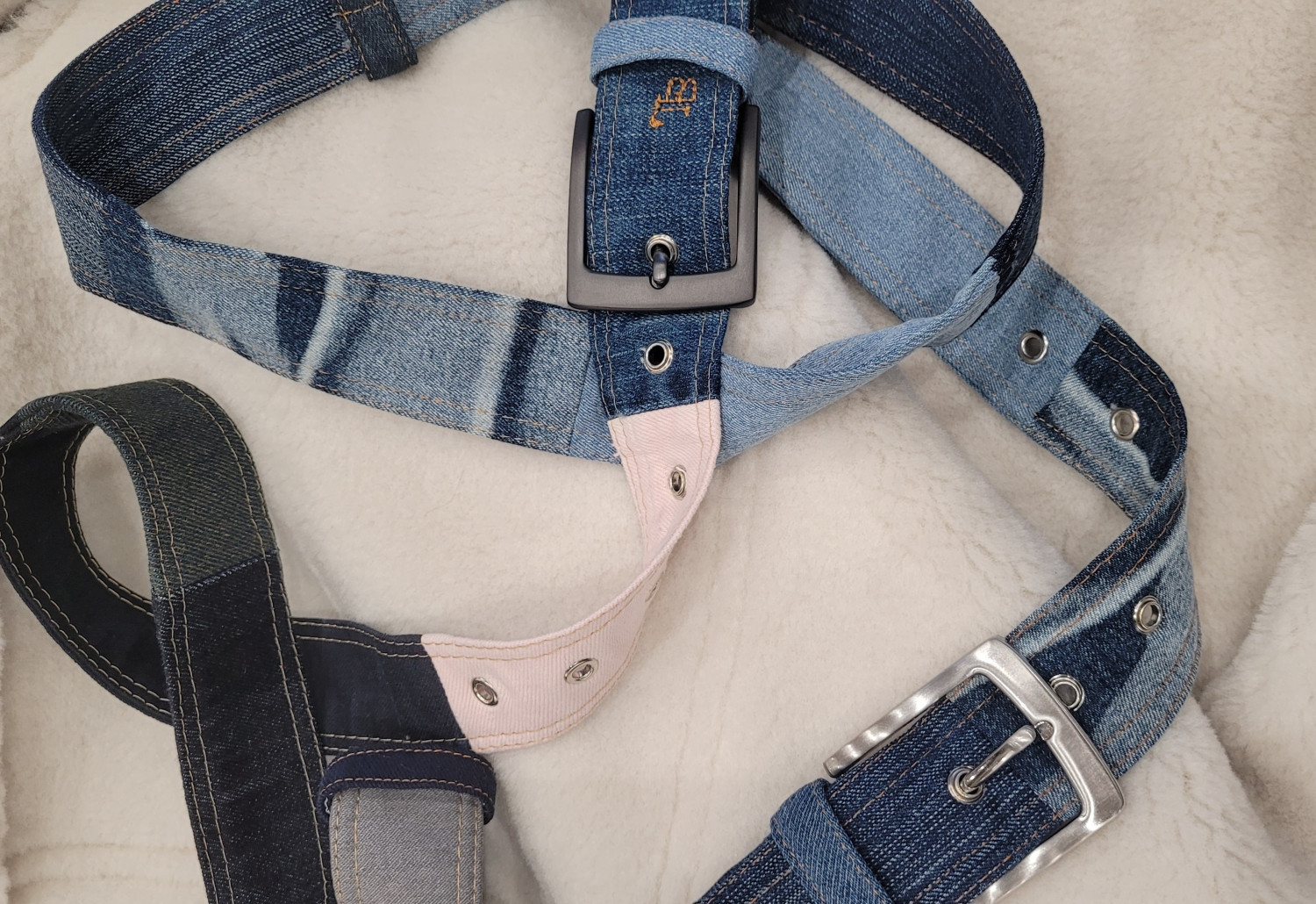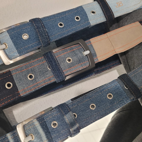 Le cinture sono realizzate con jeans riciclati assemblati insieme, formando uno stile patchwork con colori diversi. Essi sono realizzate a mano da delle sarte locali.