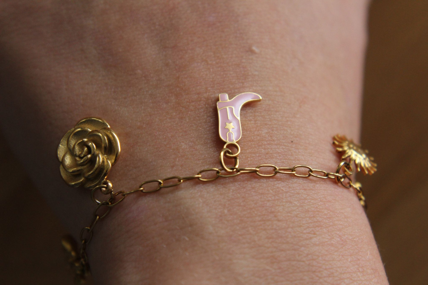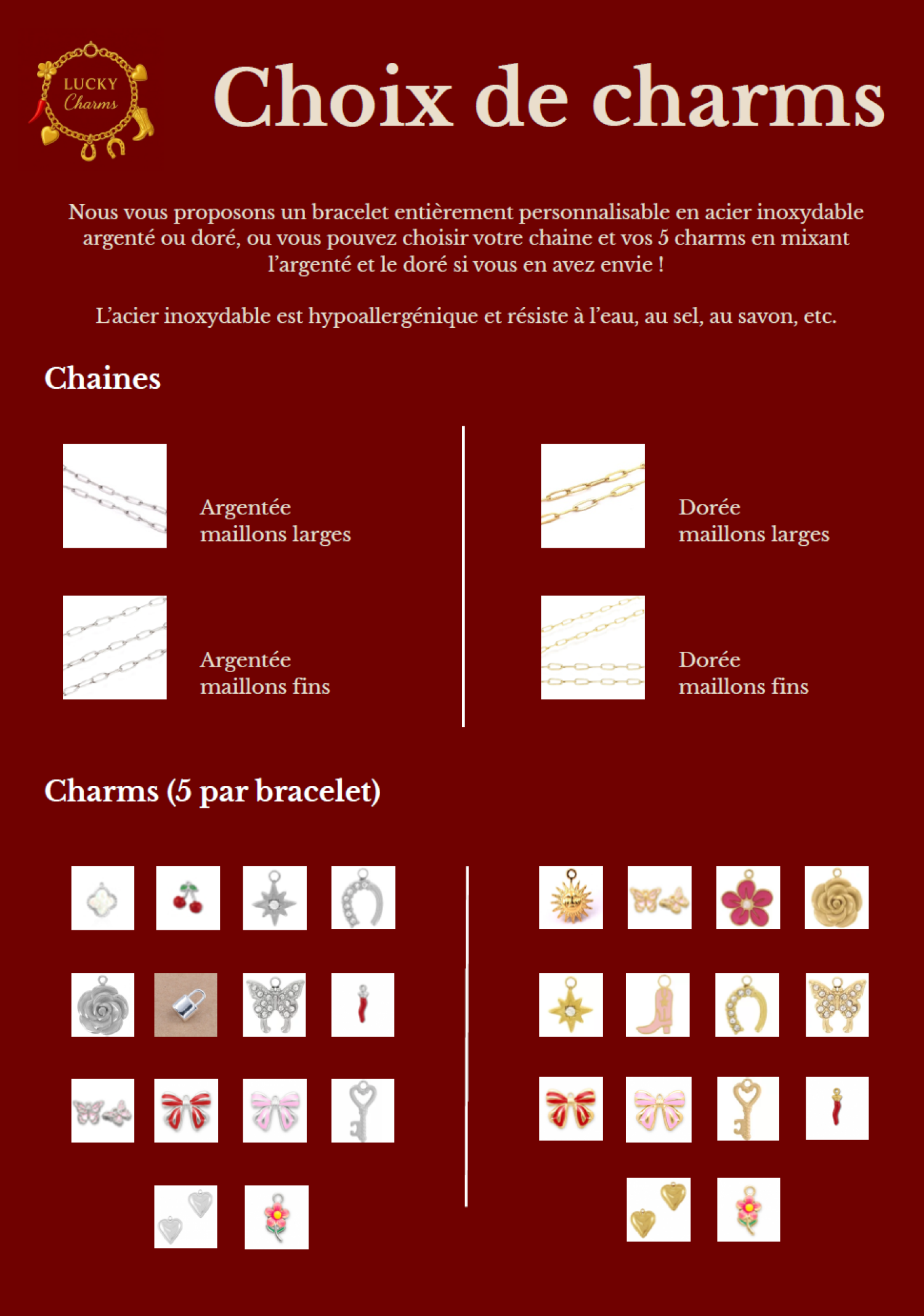 Personnalisez votre bracelet du début à la fin : choisissez votre chaine (maillons larges ou fins) puis vos 5 charms parmi notre large sélection dorée et argentée !