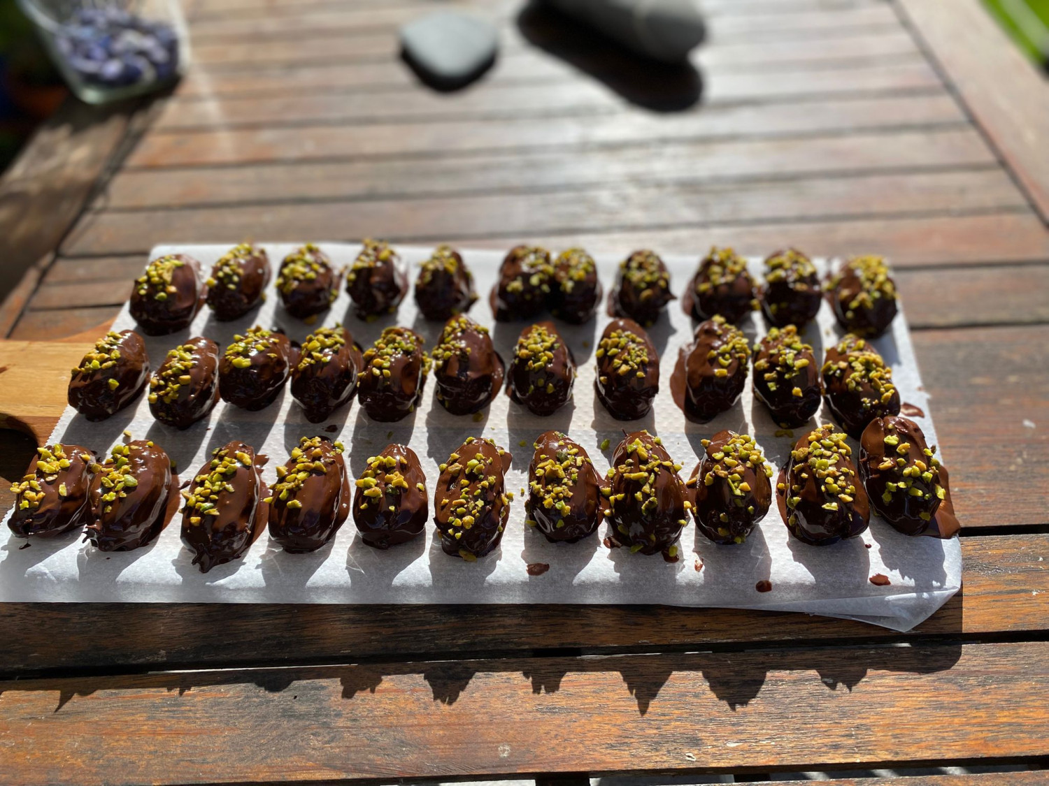 3 gefüllte Medjool-Datteln direkt aus Marokko, gefüllt mit feinster Pistaziencreme aus Italien. Ummantelt von edelster Schweizer Zartbitterschokolade, die der süßen Dattel den letzten Hauch von Perfektion verleiht.