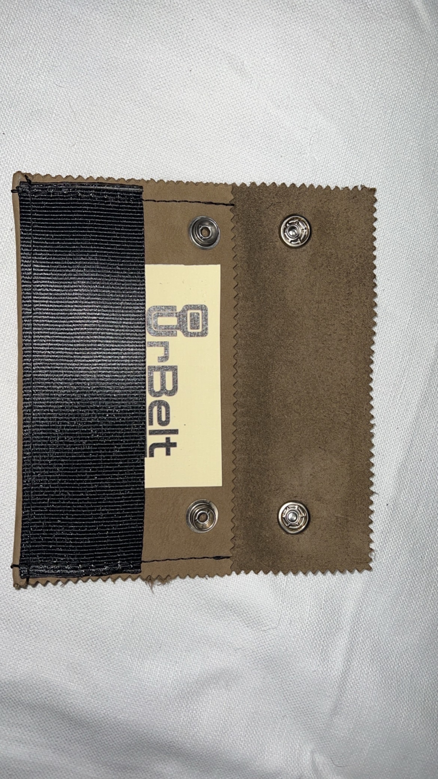 Porta oggetti versatile con pelle color marroncino chiaro e cintura di sicurezza nera riciclate, logo colore nero con bottoni a pressione argentati lucidi.