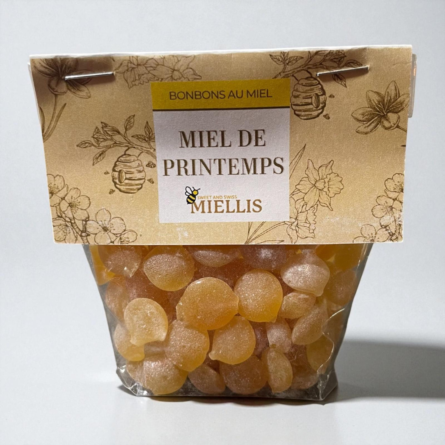 Nos bonbons au miel de printemps sont fabriqués à base de miel de notre partenaire BeeGoodie, une entreprise apicole familiale basée à Villars-sur-Glâne. Le miel de printemps est très doux en bouche, pour régaler vos papilles. Les ingrédients sont simples: du sucre, du miel et de l'eau. Paquet de 100g