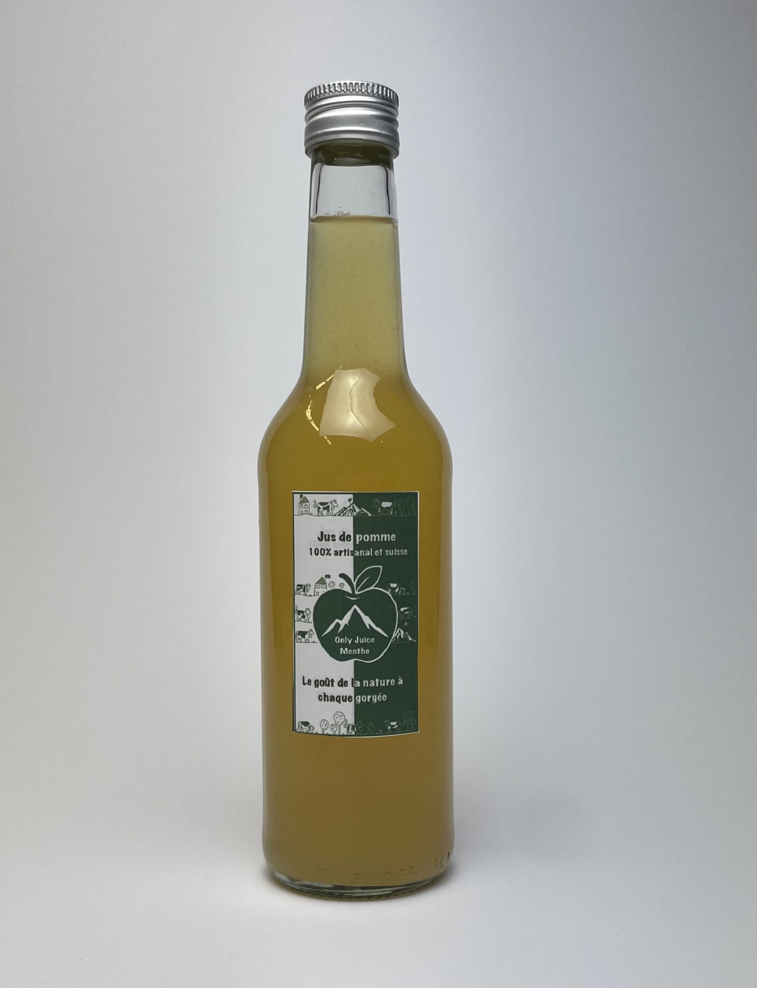 Jus de pomme menthe suisse artisanal, issu de pommes bio de la région, simplement pressées et pasteurisées, avec une touche naturelle de menthe. Sans ajout, il offre un goût frais et authentique, fidèle au terroir local (FR et VD).