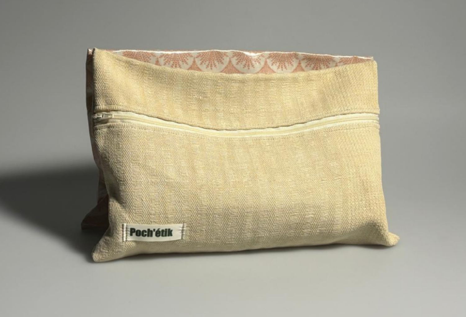 Poch’étik est une pochette divisée en deux compartiments, l’un étanche et l'autre en tissu simple. Nous recyclons de vieilles nappes et nous les teignons à partir de colorants naturels afin de les utiliser pour le côté non imperméable. Les tissus utilisés pour la partie imperméable sont certifié OEKO-TEX standard 100 afin de garantir la limitation de substances nocives pour la santé.