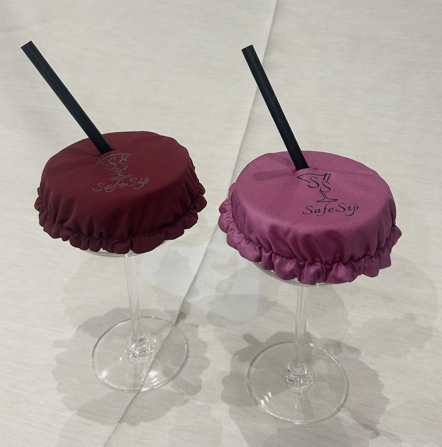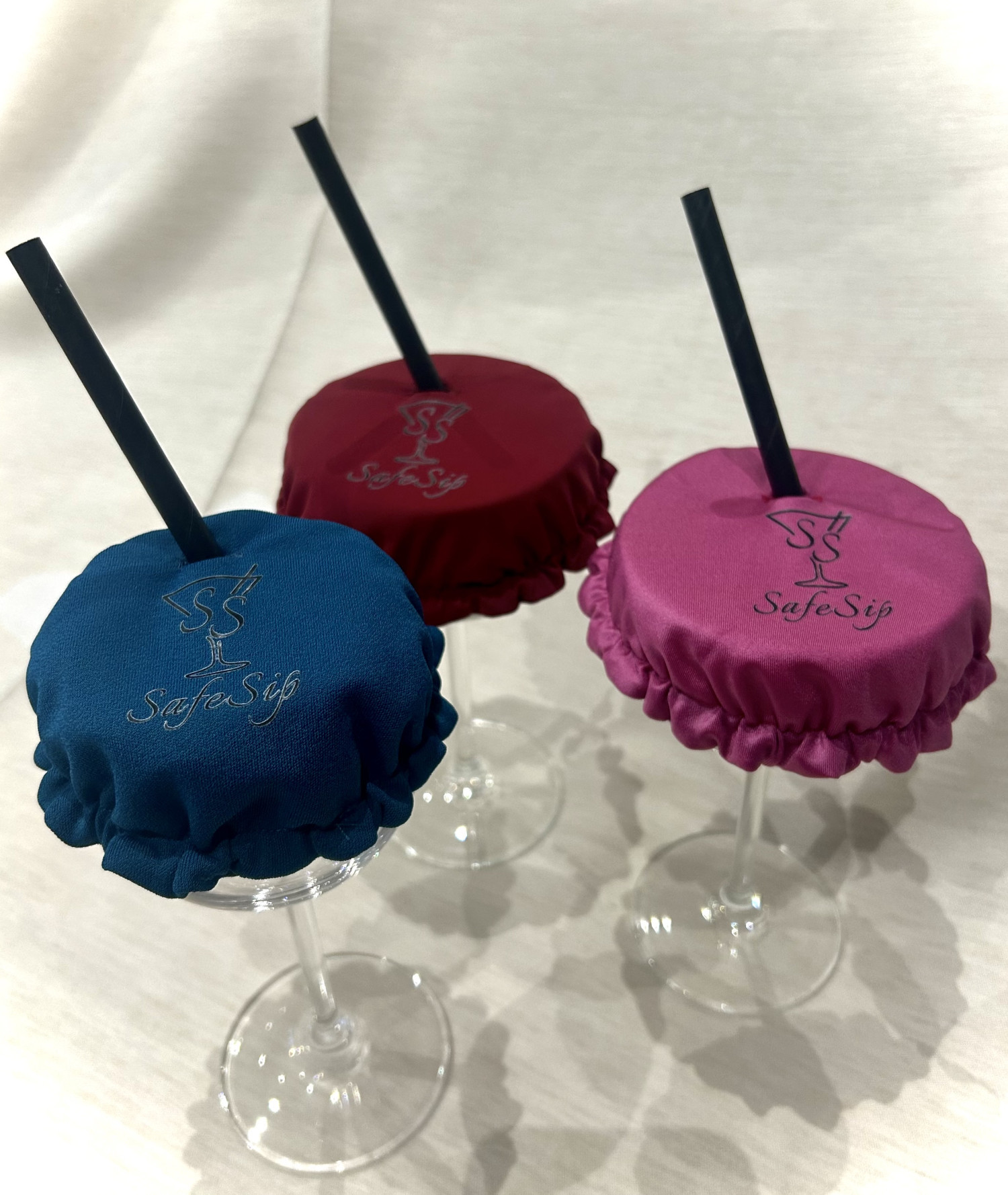 SafeSip produce copri bicchieri riutilizzabili in tessuto elastico, realizzati con stoffa riciclata e disponibili in 4 colori diversi (bordeaux, rosa, blu, arancione).